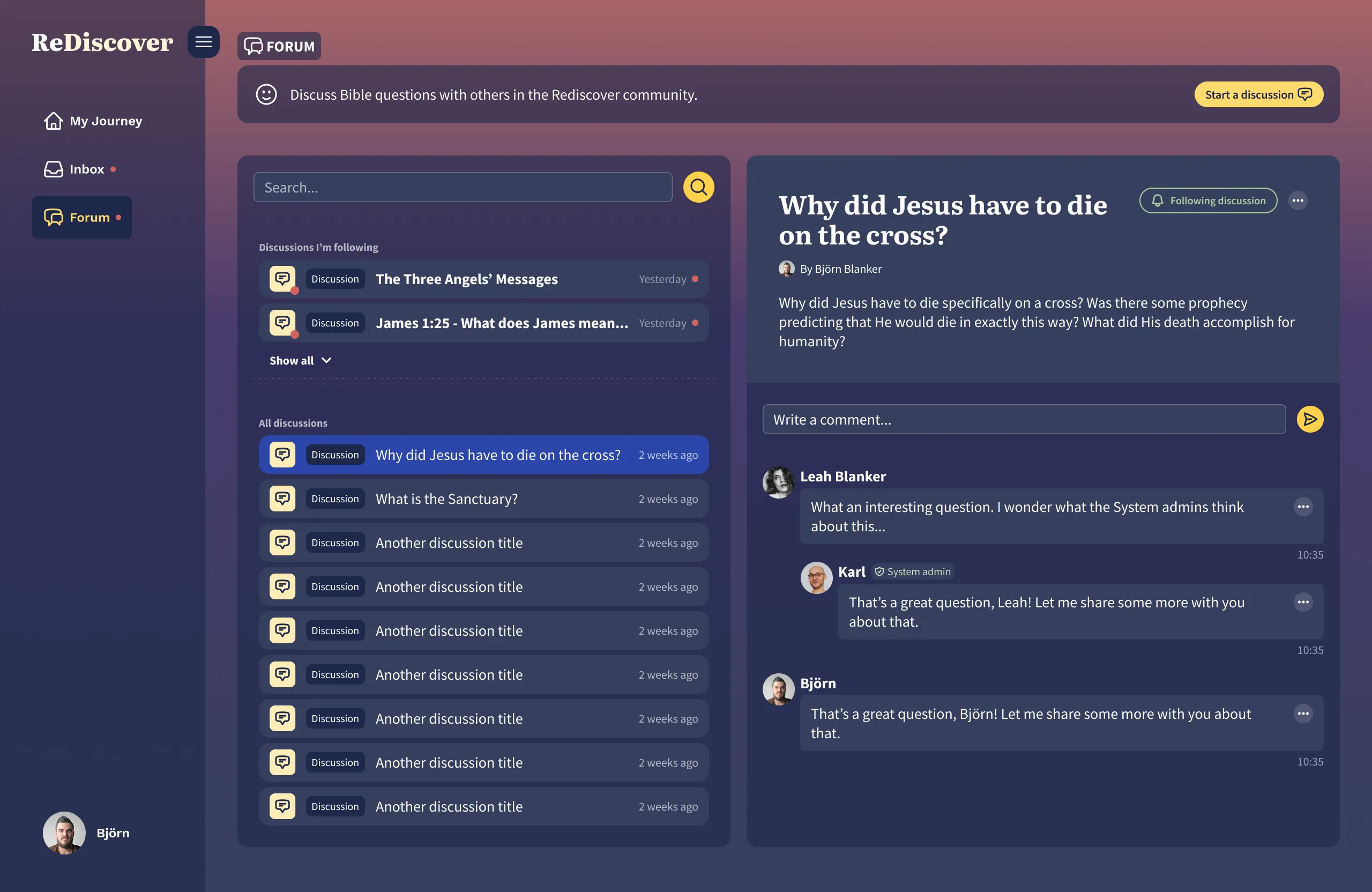 In keeping with the name of the platform, I wanted the UI to feel modern, but yet mysterious and classic. Seeing as the Bible is known as a historical book, the overall feel of the app should convey the feeling that there’s something the user doesn’t know about this book.