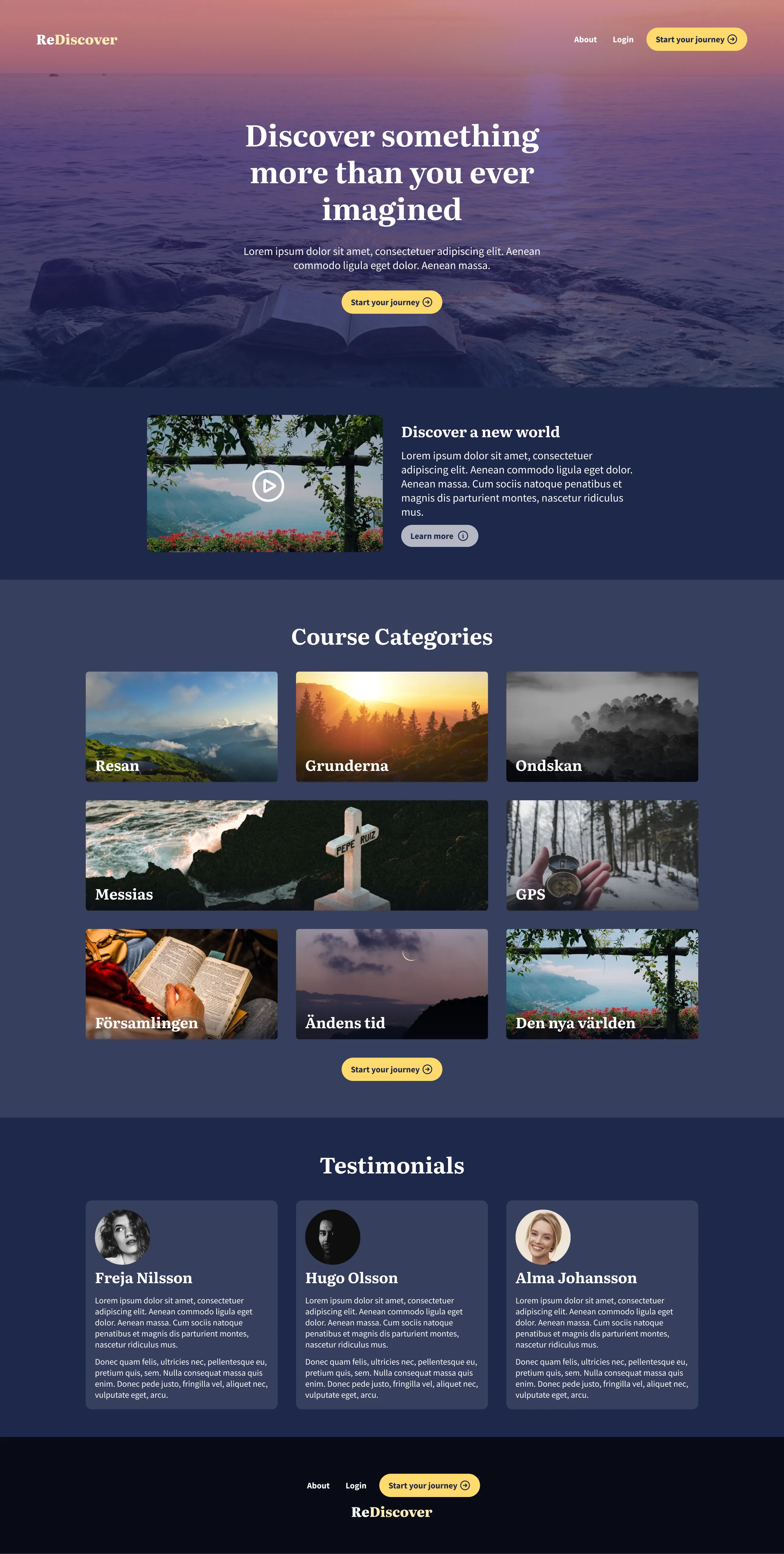 This is why I ultimately chose for a relatively simple and classic logo design using a serif font along with a dark color palette for the user interface. To convey the feeling of hope that is demonstrated in the lessons of this e-platform, I chose to mimic the ombre gradient effect of a sunrise, with the background color starting dark at the bottom but getting lighter and warmer higher up on the page.